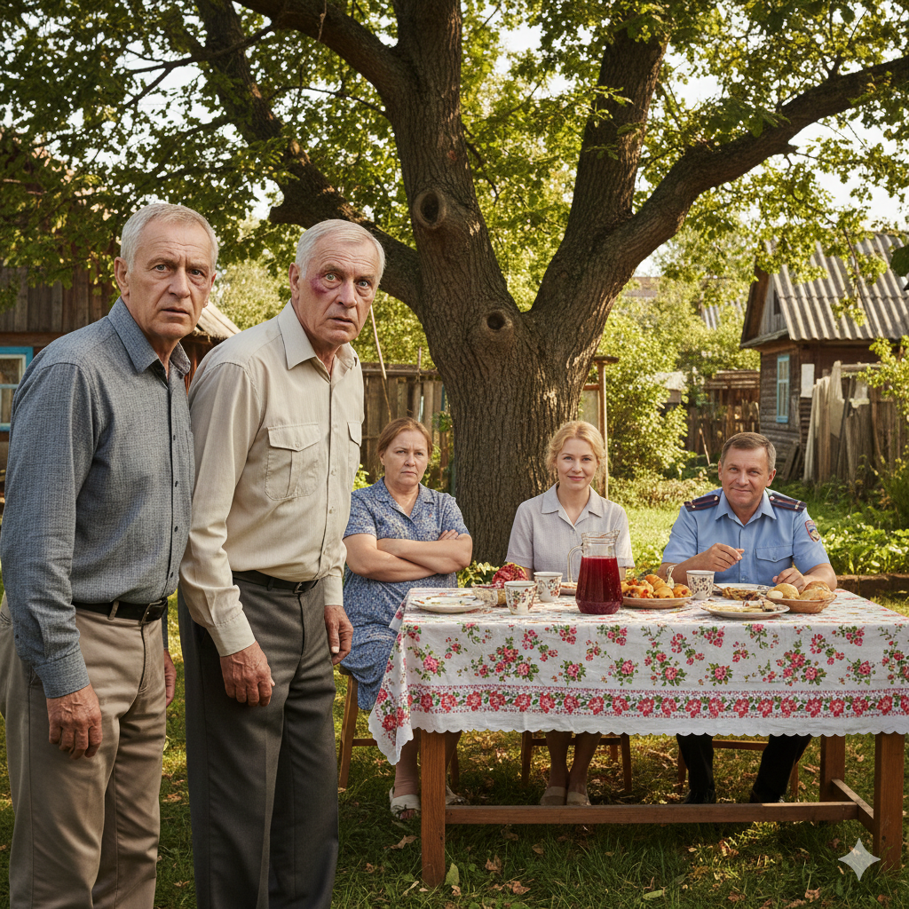 Прямо посреди дачного участка, под раскидистым дубом, который так любила хозяйка, стоял большой обеденный стол, принесенный с веранды. Стол был застелен нарядной скатертью и ломился от разнообразных блюд. В центре стола красовался большой графин с малиновым киселем. За столом, безмятежно улыбаясь, сидели хозяйка, ее сестра и участковый.