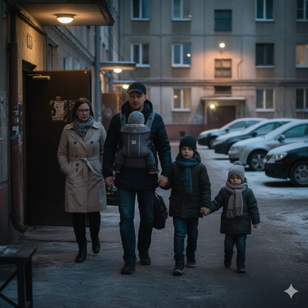 Влада не узнала бы его, если бы не заметила знакомую кепку, ведь на нем был надет рюкзак-кенгуру, в котором сидел ребенок. Рядом шел мальчишка лет восьми, а за руку с ним вышагивал еще один мальчик, лет трех. Процессию завершала дама в плаще и очках.