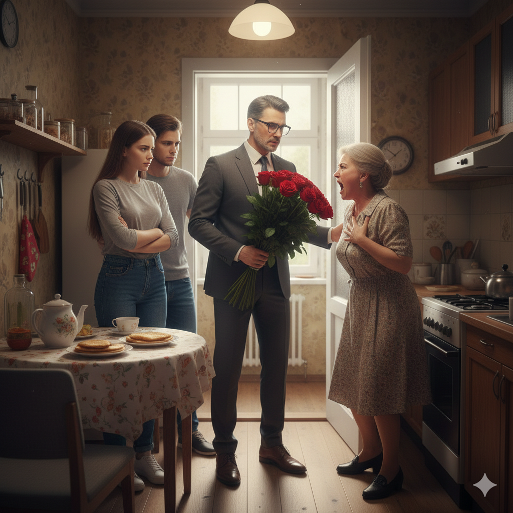 Он был в сером элегантном костюме, который сидел на нём безупречно, подчеркивая седину на висках. В руках он держал букет.