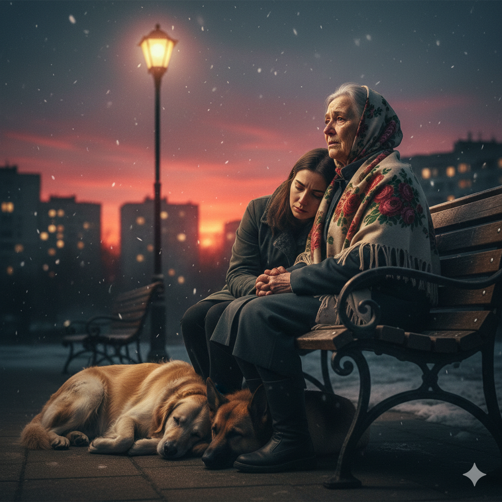 Серое небо. Красный закат. Две женщины на скамейке. Две собаки у ног.