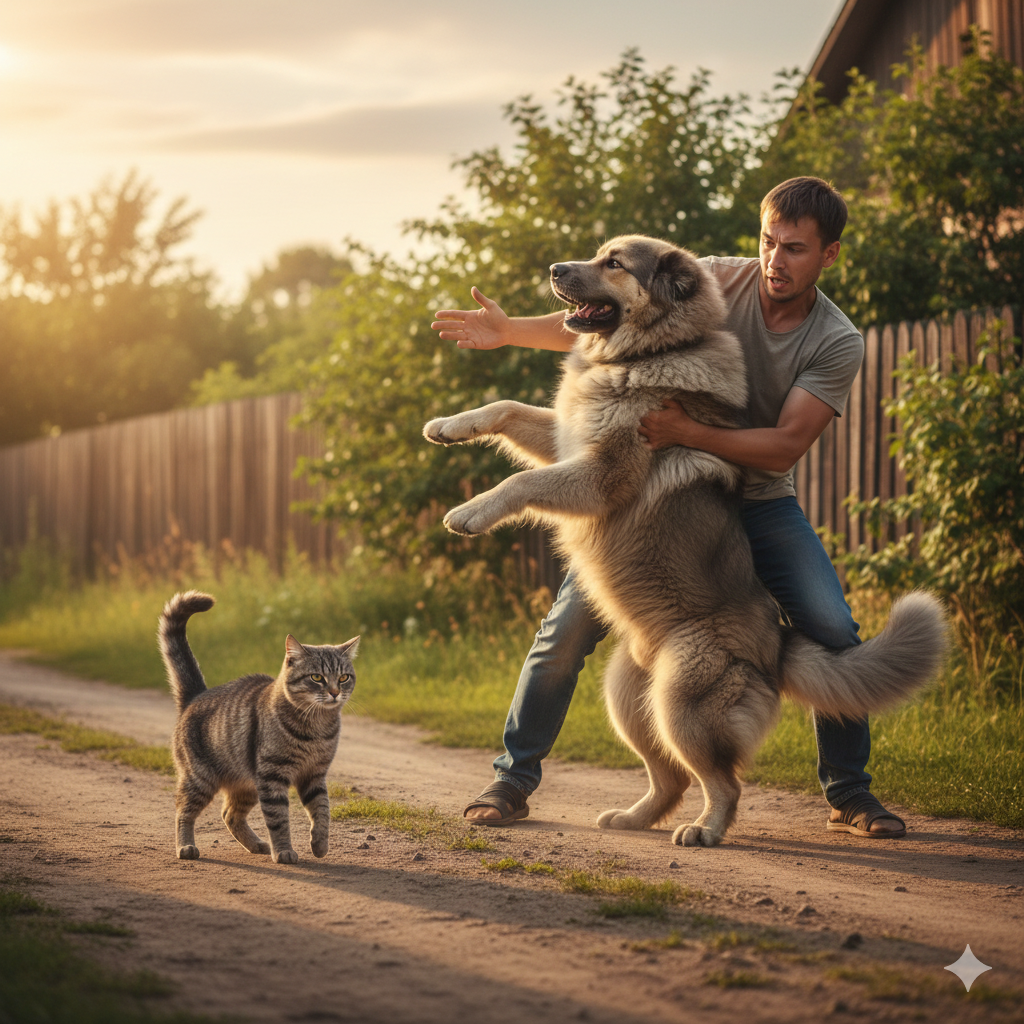 Но пёс совсем не слышал своего хозяина. Он медленно, но уверенно разогнался, и уже нёсся прямо на кота.