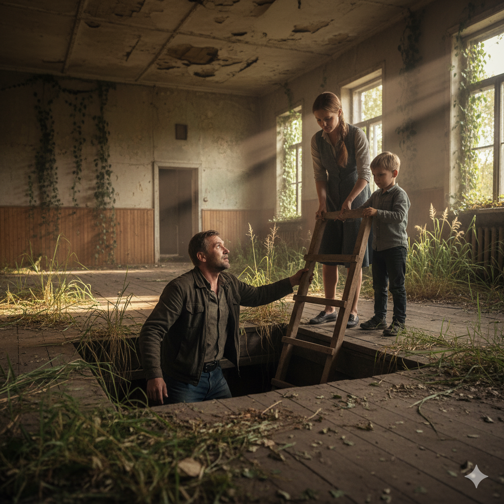 Маршрут проходил мимо той самой ограды, скрывавшей старую танцплощадку. Михаил улыбнулся, остановил автомобиль, извлёк из багажника монтировку и без труда протиснулся в расширенную щель. Всё выглядело заброшенным, включая строение, где раньше размещались столики. Михаил осторожно вошёл внутрь. Пол скрипел, трещал. Только травмы ноги не хватало. В этот момент под ним что-то треснуло. Михаил провалился, болезненно ударился коленом, но устоял на ногах. Взглянул вверх — добрых три метра. Осмотрелся, насколько позволял полумрак. Не подвал, а яма с отвесными ровными стенами. Михаил осознал: как ни кричи, никто не услышит. Он пытался звать на помощь, но ограда находилась в двадцати метрах от здания, плюс прочные стены самого строения. Затем попробовал подпрыгнуть, чтобы зацепиться, — безуспешно.