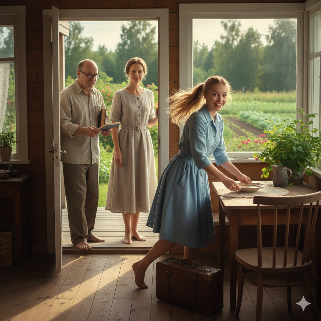 Она вышла. Распахнула калитку, но вместо молочницы перед ней стояла юная девушка с золотистым хвостиком, перетянутым тесьмой. Ее голубое платье чуть выше колен, в руках чемоданчик.