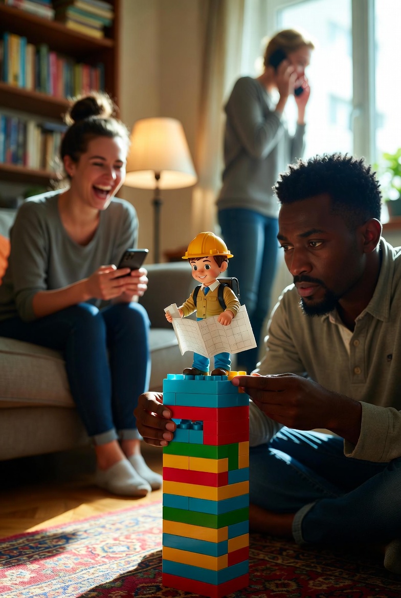Борис сидел на полу в гостиной, сосредоточенно хмуря брови. Перед ним лежала россыпь разноцветных пластиковых кубиков – красных, синих, жёлтых, зелёных. Он аккуратно ставил один на другой, стараясь точно следовать указаниям своего трёхлетнего сына Димы. Малыш расположился рядом, всерьёз возомнив себя главным архитектором этого грандиозного сооружения. Он внимательно следил за каждым движением отца, то и дело подаваясь вперёд и вытягивая пухлую ручку, чтобы показать, куда именно нужно поставить очередной кубик.