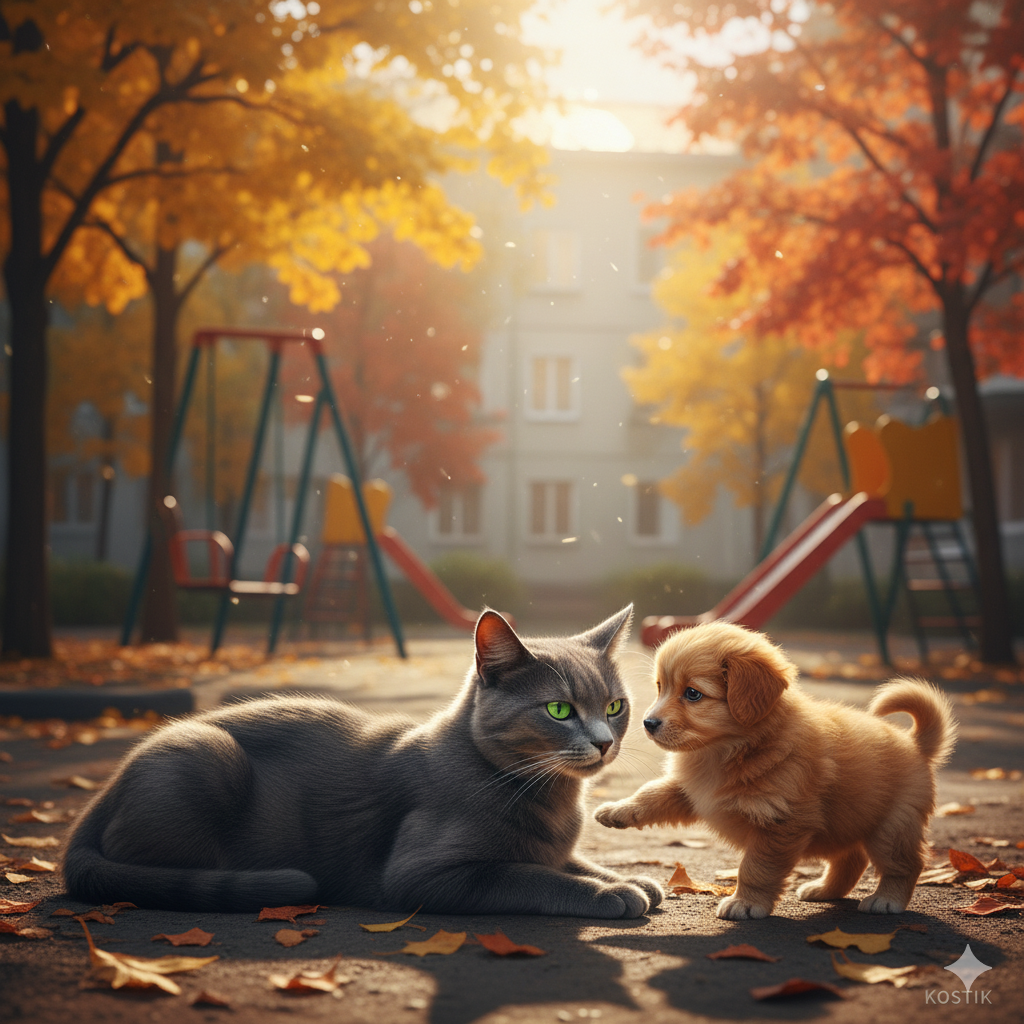 Костик послушно сидел на руках в предвкушении прогулки. Хорошо, что спускаться долго не надо было, семья жила на первом этаже. Антон поднёс Костика к любимому дереву. Кот запрыгнул на ветку, и вдруг – небольшое серое существо мелькнуло вдалеке за мусорными баками!