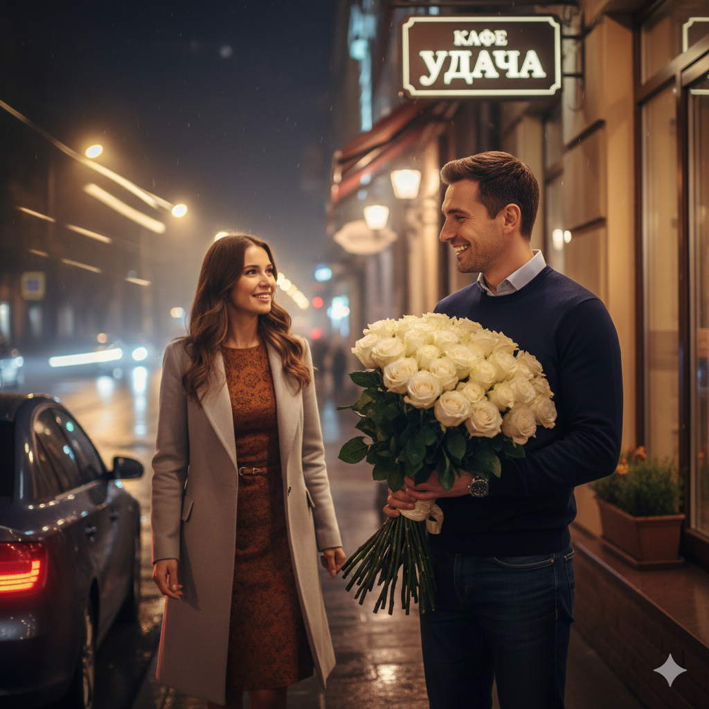 Сидела и рассматривала всех, кто подходил к кафе или стоял рядом. Около входа в кафе стоял молодой мужчина с букетом белых роз, стоял к ней вполоборота и смотрел на пешеходную дорожку, видимо думая, что девушка придет оттуда.