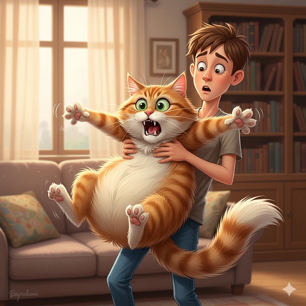 — Мяу!! Мой хозяин сошел с ума! Спасите! Он рвет меня на кусочки! Я не вкусный, люди не едят кошек. Обещаю похудеть и не обзываться, только спасите от ненормального!