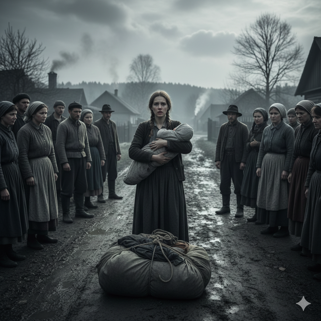 В самом центре деревни, посреди дороги стояла молодая девушка с ребёнком на руках. У её ног валялся в пыли огромный тюк с её не хитрым скарбом.