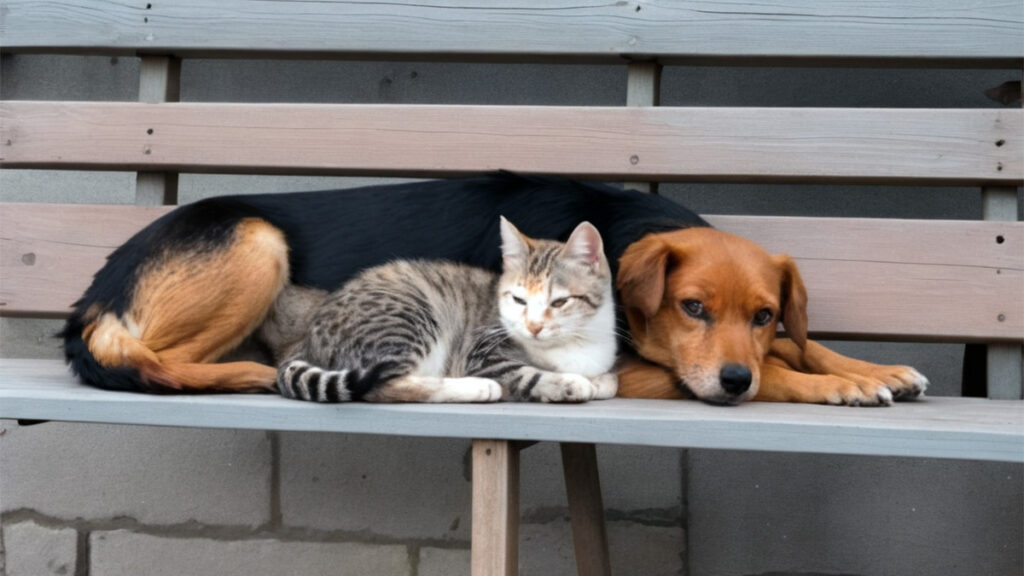 Они сидели на скамейке и болтали. Булька и Барон, набегавшись, подошли к ним и, забравшись на скамейку, внимательно наблюдали за разговором.