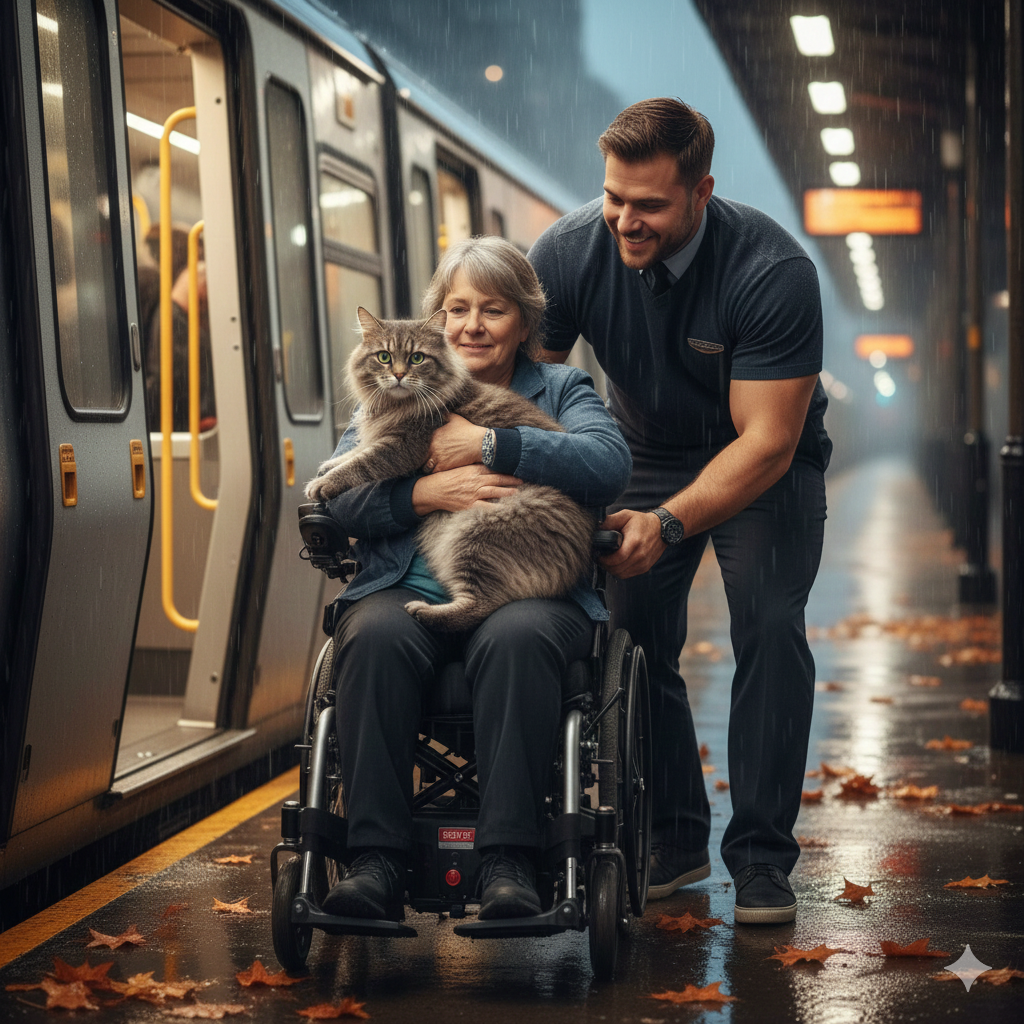 Пока она сидела на перроне с котом на коленях и раздумывала, что ей делать, подошла её электричка и весёлый контролёр выбежал и, схватившись за ручки её коляски, ахнул: