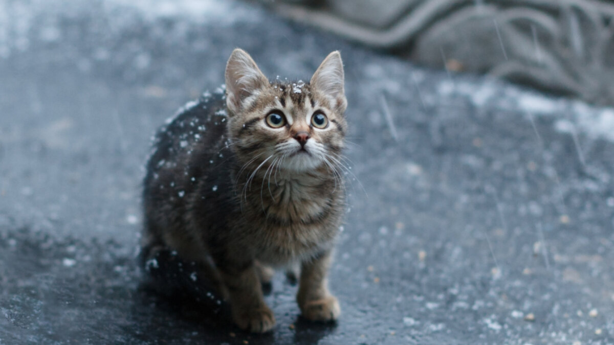Маленький серенький котенок стоял на покрытом льдом тротуаре и что-то кричал прохожим.