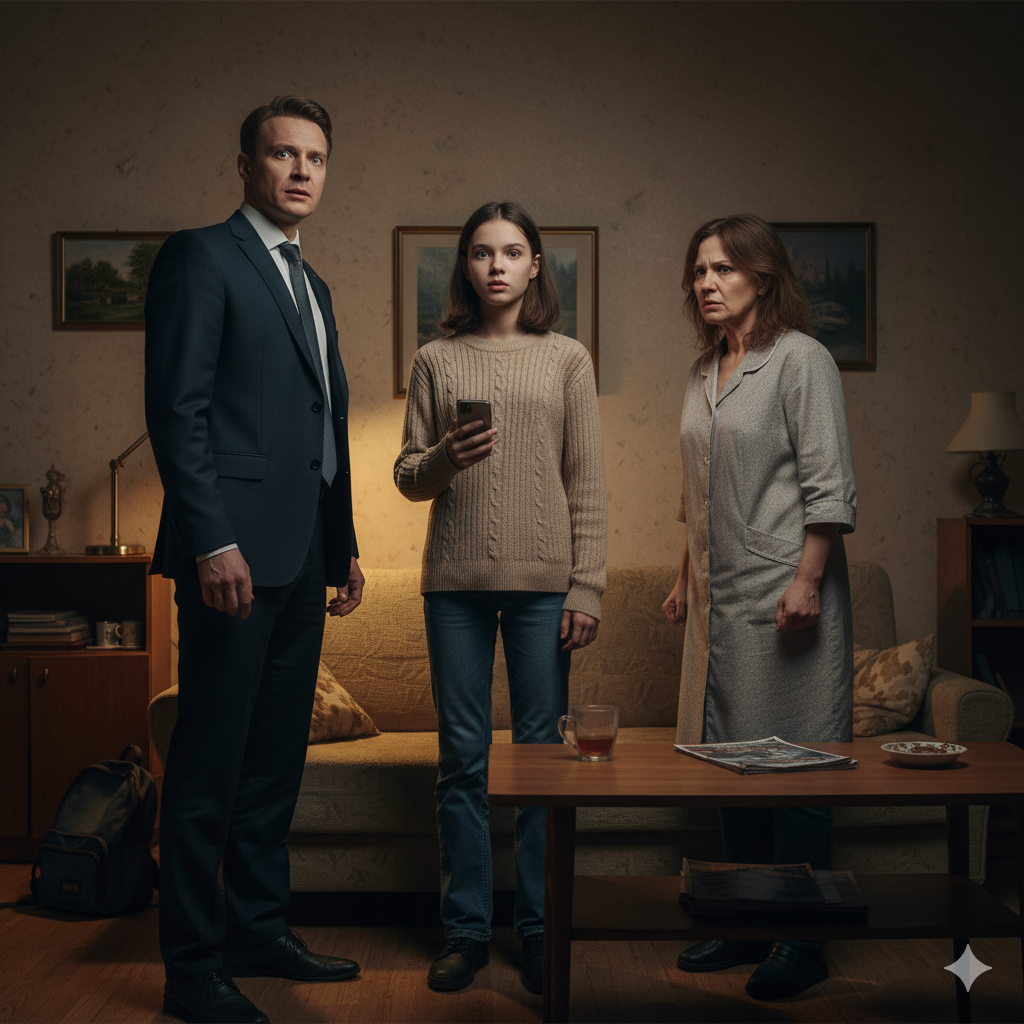 Постепенно крики стихали. Оба родителя, устав от ссоры, сели на диван, пытаясь прийти в себя. Соня всё ещё стояла в стороне, не решаясь вмешаться.