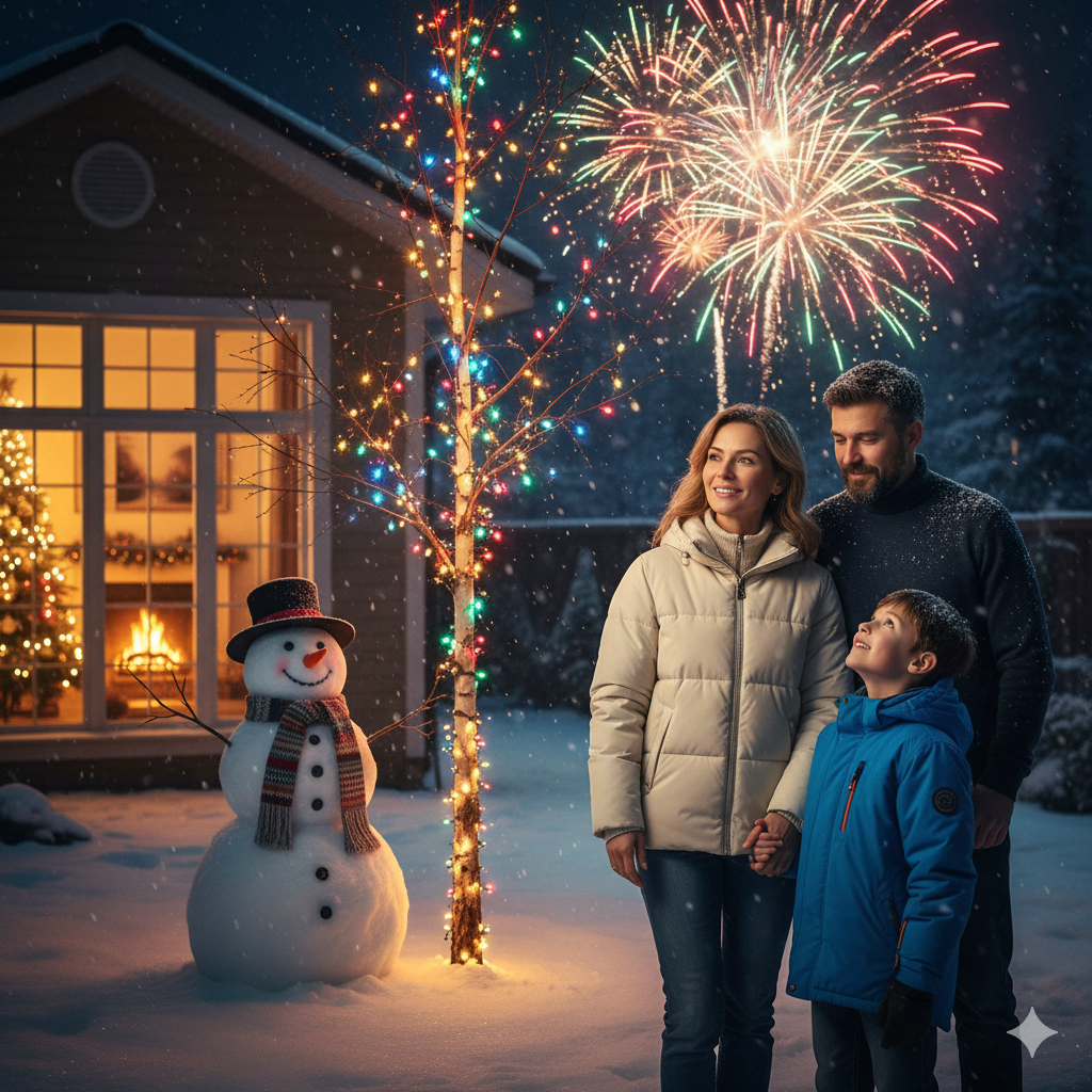 Виктор с внуком купили фейерверки, во дворе на березу повесили гирлянды, она светилась разноцветными огоньками, даже снеговика слепили, как раз была оттепель, а к Новому году похолодало. В доме тоже стояла наряженная искусственная елка.