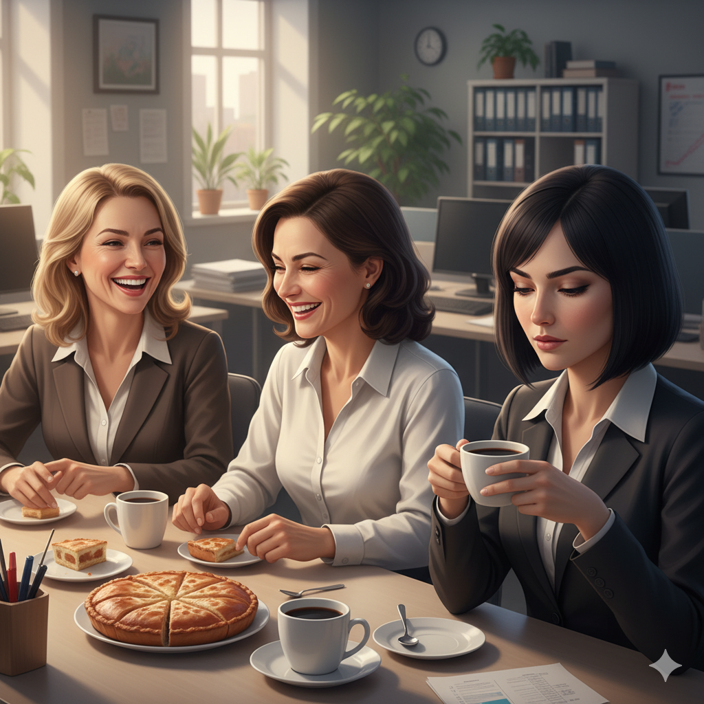 Как всегда, за утренним чаепитием на работе, сотрудницы из бухгалтерии рассказывали новости семейной жизни. О мужьях, детях, родителях, о приготовленных блюдах, о домашних и дачных хлопотах. И было ощущение какой-то семейности в коллективе.