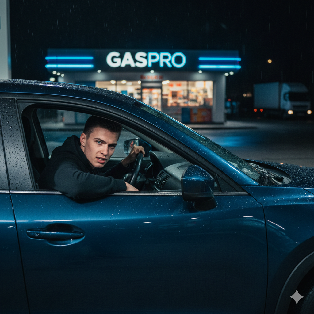 Елена остановила свою «Мазду» у колонки и вышла из машины. Тут же рядом возникла фигура парня в чёрной толстовке с капюшоном на голове. От неожиданности Елена вздрогнула.