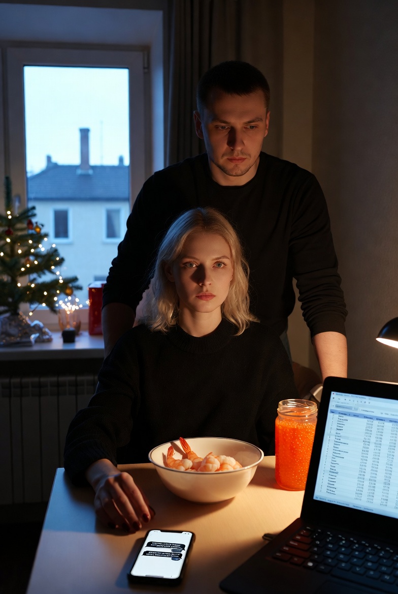 Дома они встретили Новый год вдвоём. Ольга выложила на стол простые продукты — те самые дешёвые креветки, форелевую икру. Максим смотрел на стол и не нашёлся что сказать.