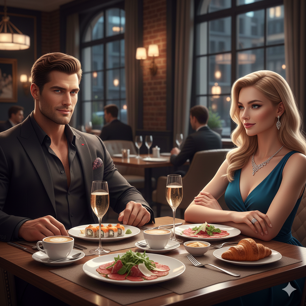 Подошли к столику, мужчина вежливо отодвинул стул для неё, потом сел напротив. Она небрежно полистала меню, откинулась на спинку стула, слегка махнула звякнувшей дорогими браслетами рукой: