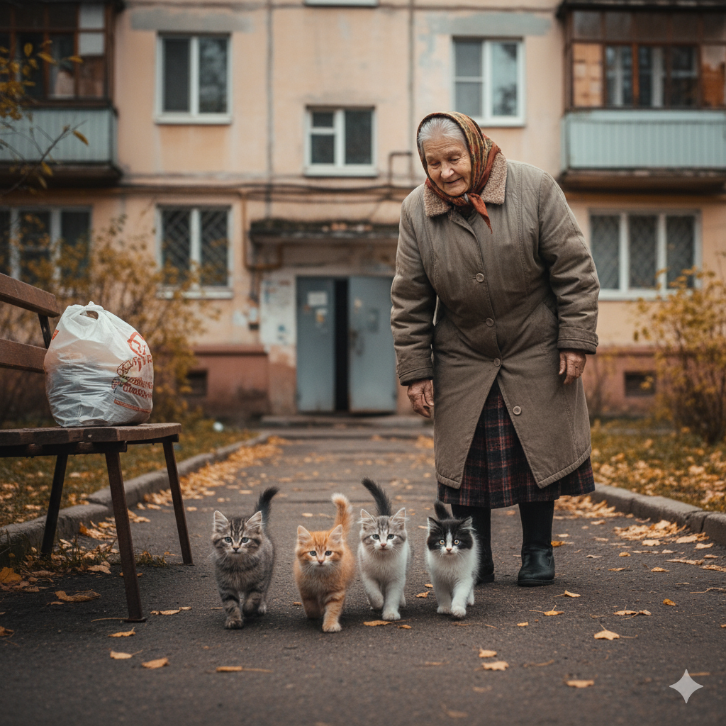Когда мужчина ушел, Валентина Николаевна подошла к подъезду, поставила пакет на лавочку и стала смотреть по сторонам. А буквально через секунду из укрытия выскочили котята и, радостно мяукая, побежали навстречу своей любимой бабушке.