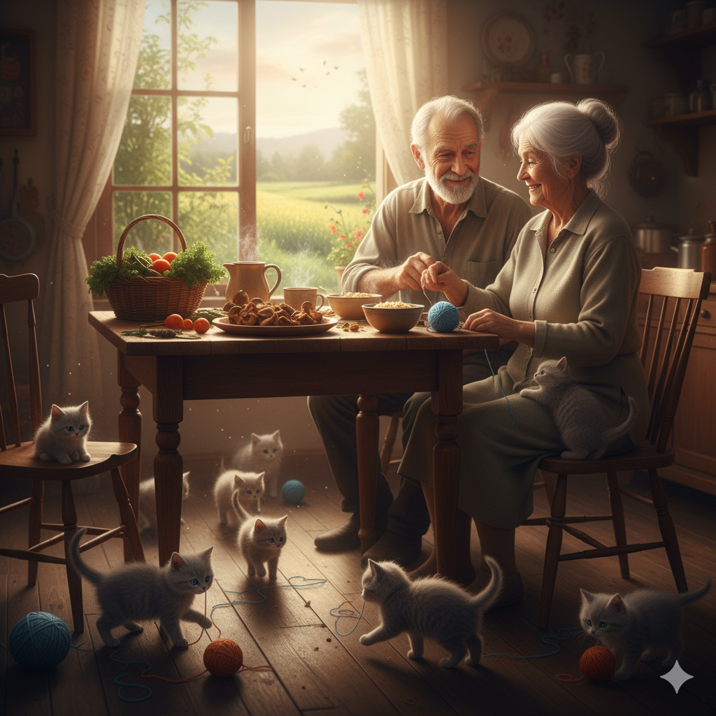 Вечером, после дня, полного трудов и забот, дед Захар и бабушка Нина с улыбкой наблюдали за игрой котят. Те гонялись друг за другом, боролись и весело попискивали.