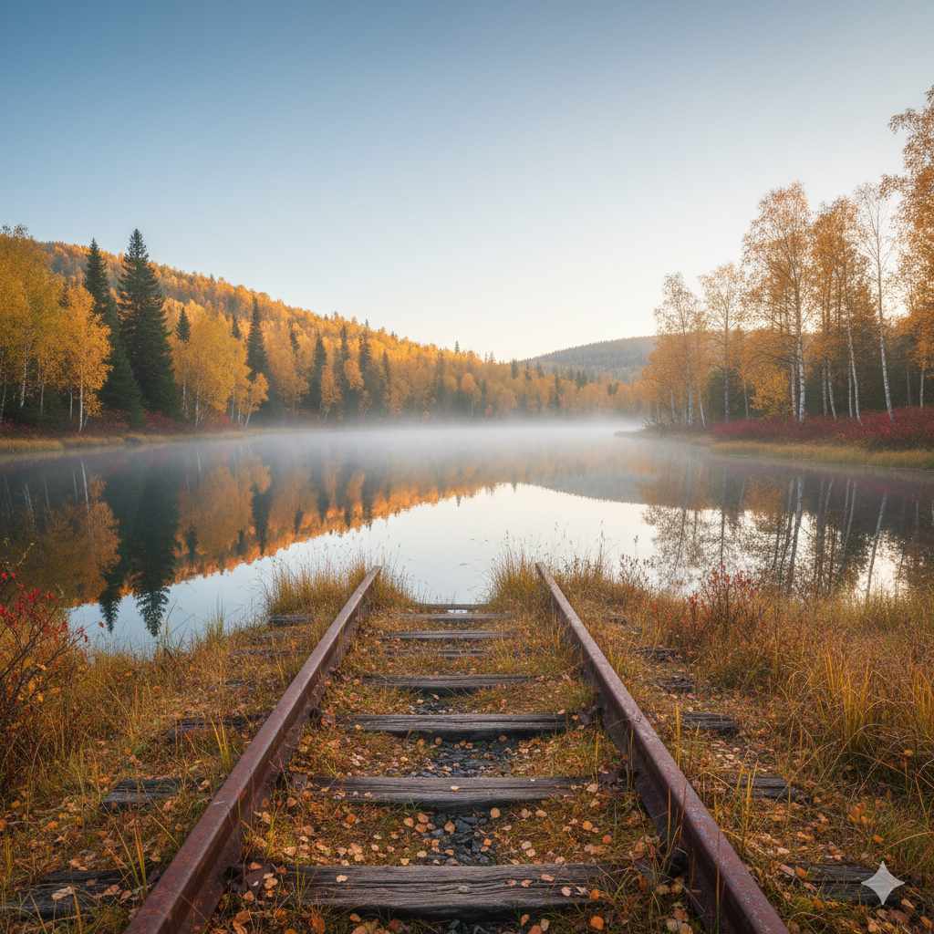 Как раз в такое золотое время, в начале октября, весь учительский состав местной школы выехал на озёра праздновать свой профессиональный день. Ольга ехала туда впервые. Место было и правда райским: цепочка маленьких прозрачных озёр, соединённых тонкими перешейками из белого песка. По берегам — молодые берёзки, уже сбросившие листву, их стройные белые стволы, как свечи, отражались в неподвижной воде. А посреди этой идиллии — чёрные, пропитанные мазутом шпалы и ржавые рельсы брошенной узкоколейки, уходящие в чащу. Золото, синева, чёрный металл. Красота и грусть, смешанные в одну густую, щемящую субстанцию.