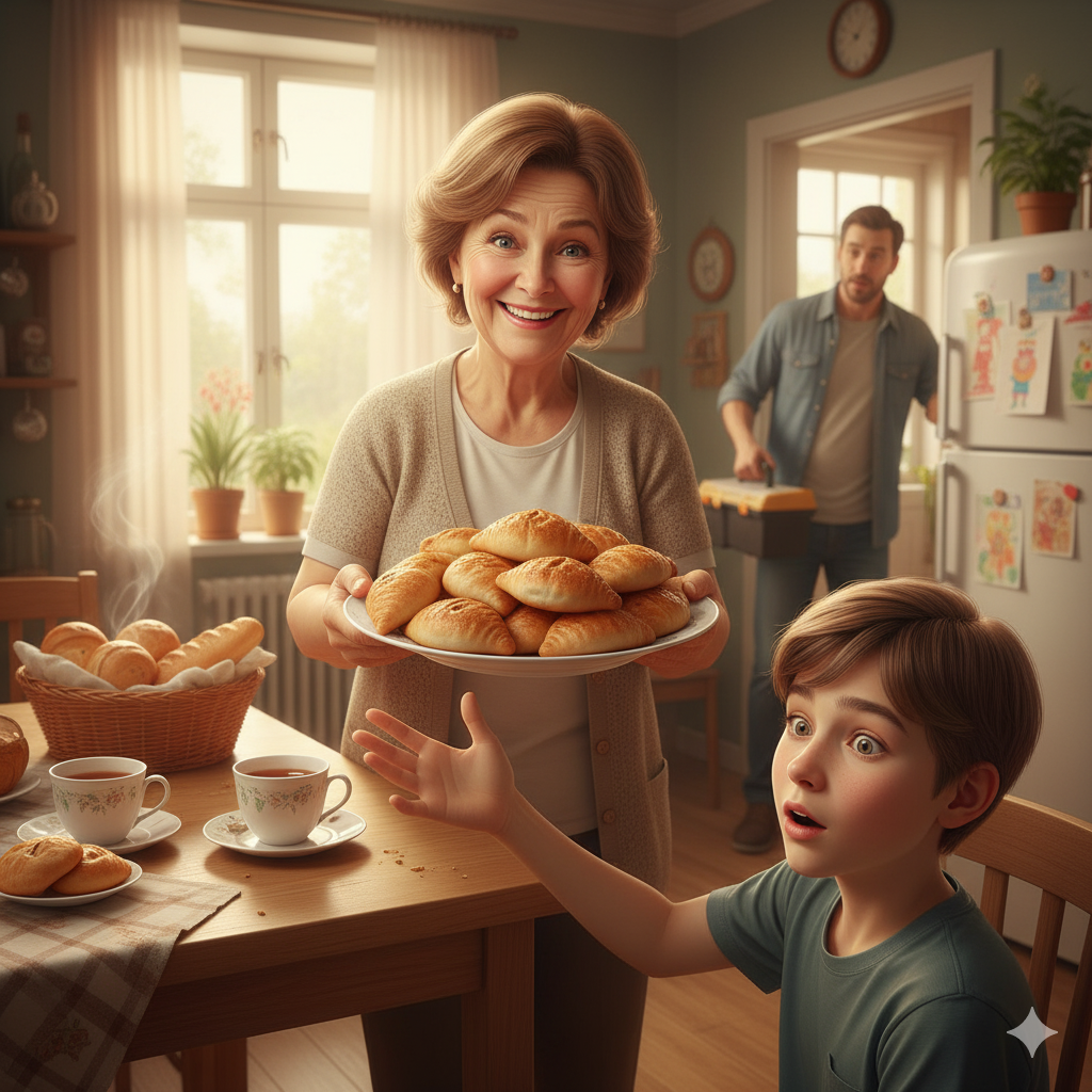 — Мам, можно еще пирожок? Очень вкусные, ты купила где-то? — заскочил на кухню сын.