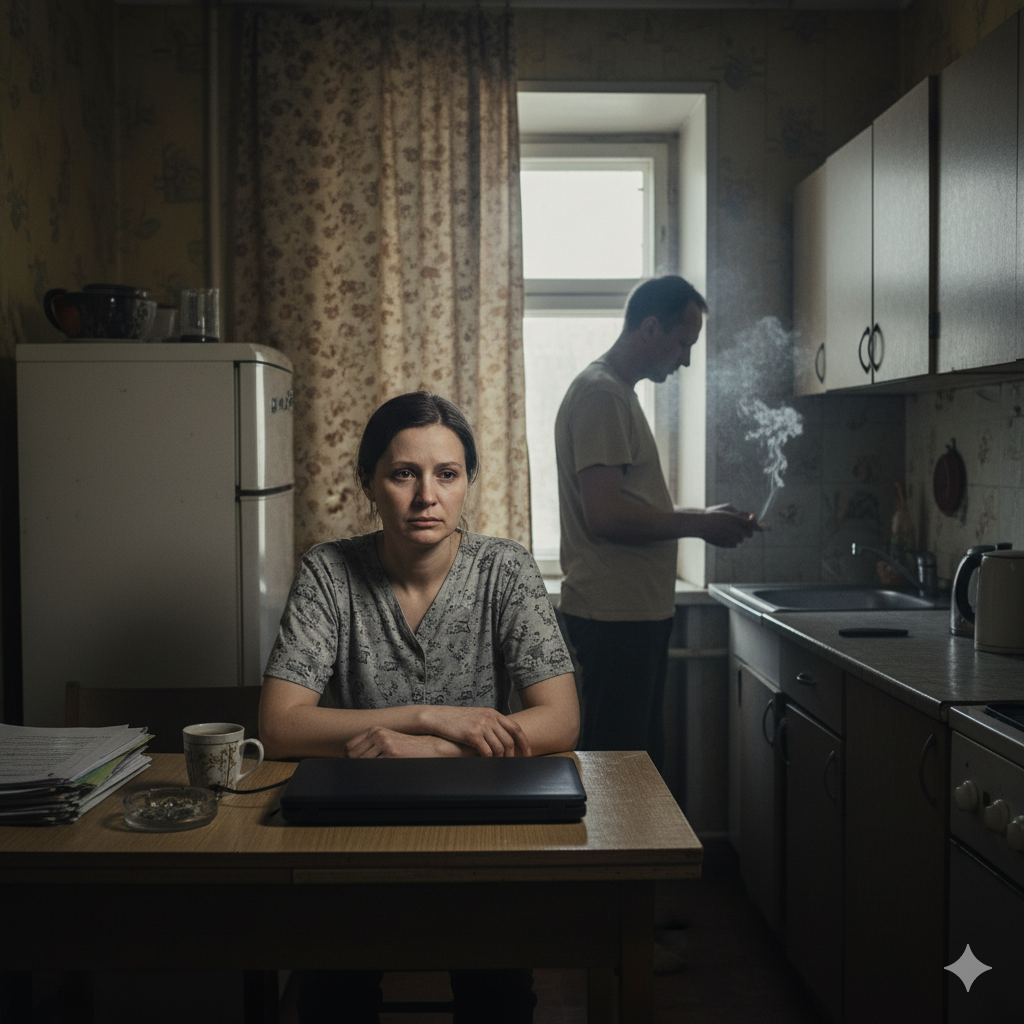 — Ты опять не ужинала? — Сергей стоял на кухне, облокотившись на раковину, с сигаретой в руке. Комната пахла дешевым табаком и чем-то затхлым, как в общежитии.