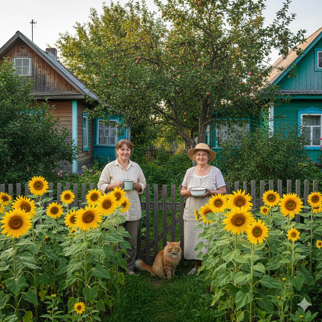 К концу лета подсолнухи обзавелись цветками-корзинками, полными семечек. И тут Петровна удивила Семеновну: