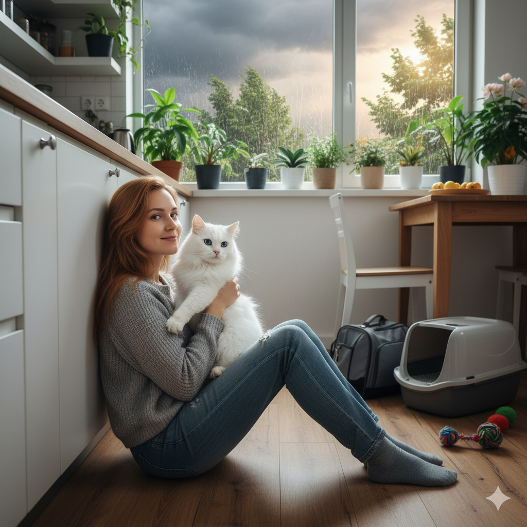 Белоснежная пушистая кошка затаилась в дальнем углу переноски. Небо хмурилось всё сильнее, всё более мощные порывы ветра безобразничали в кронах деревьев и пугали прохожих.