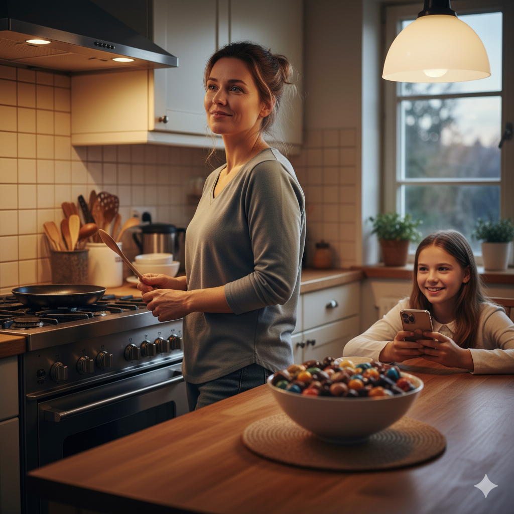 Прошли сутки. Алёна стояла у плиты, помешивая суп, и вдруг поймала себя на том, что снова ломает голову. Новое слово, то самое, «сладкое и вкусное», напрочь испарилось из памяти. Она перебирала варианты: «Пирожное»? Нет. «Карамелька»? Тоже не то. В голове была пустота.