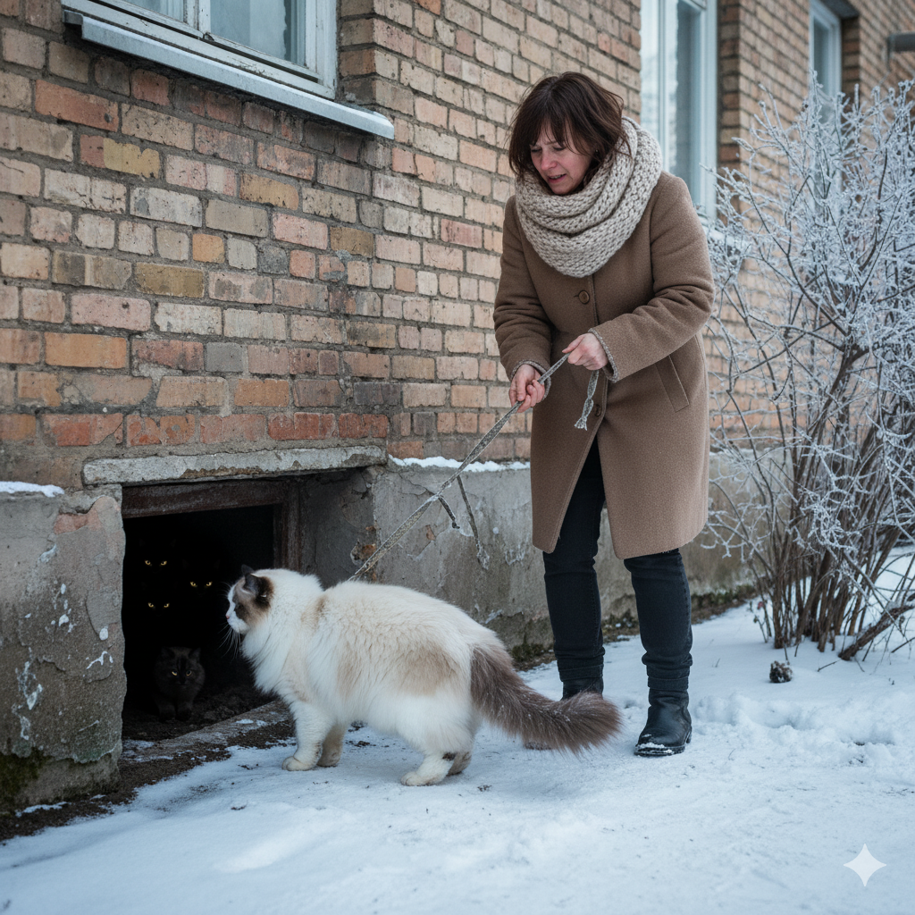 А кот вдобавок ко всему ныряет вдруг в чёрный лаз — обиталище этих детей подземелья, и теперь только два красных огонька глаз светятся из глубокой черноты, да обрывок поводка остаётся снаружи…