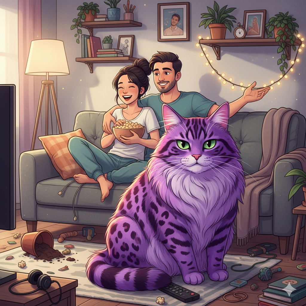 Теперь они живут в полной гармонии и задумываются о ребёнке, которому, кстати, не придётся у родителей просить котёнка. У него будет самый лучший на свете фиолетовый кот.