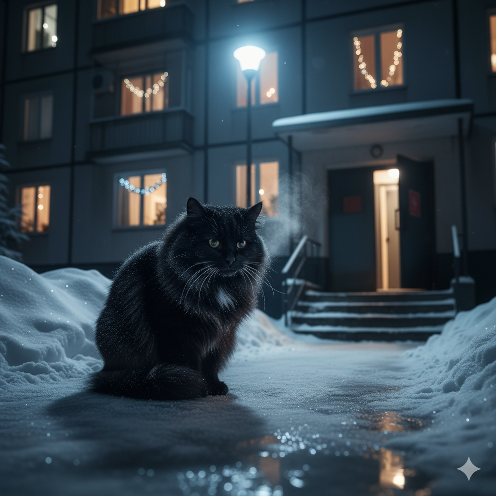 Там, за окнами, где горит мягкий свет и мерцают разноцветные огоньки, идёт совсем иная и беззаботная жизнь. Ещё недавно чёрный кот был её неотъемлемой частью и даже не помышлял, что может быть иначе…