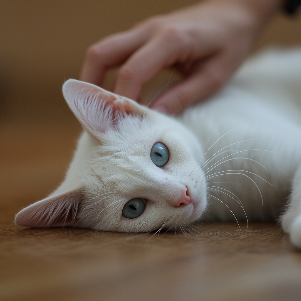 Лина решила посушить Белку феном и заодно расчесать. Вспомнила, что голубоглазые белые кошки могут быть глухими, и резко включила фен за спиной у занятой едой кошки.
