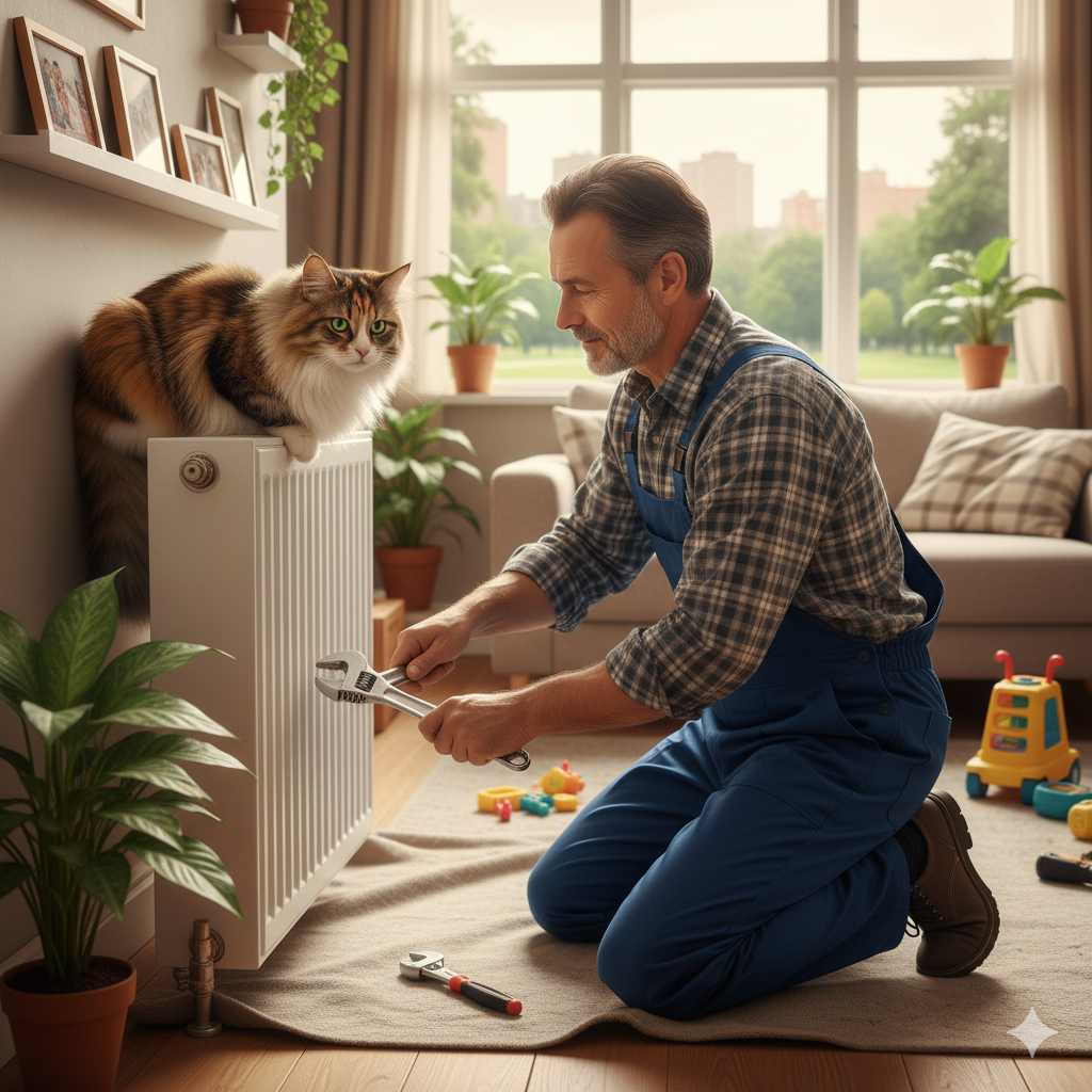 Сантехник недоверчиво потянулся к батарее и тут же получил удар по руке кошачьей лапой!