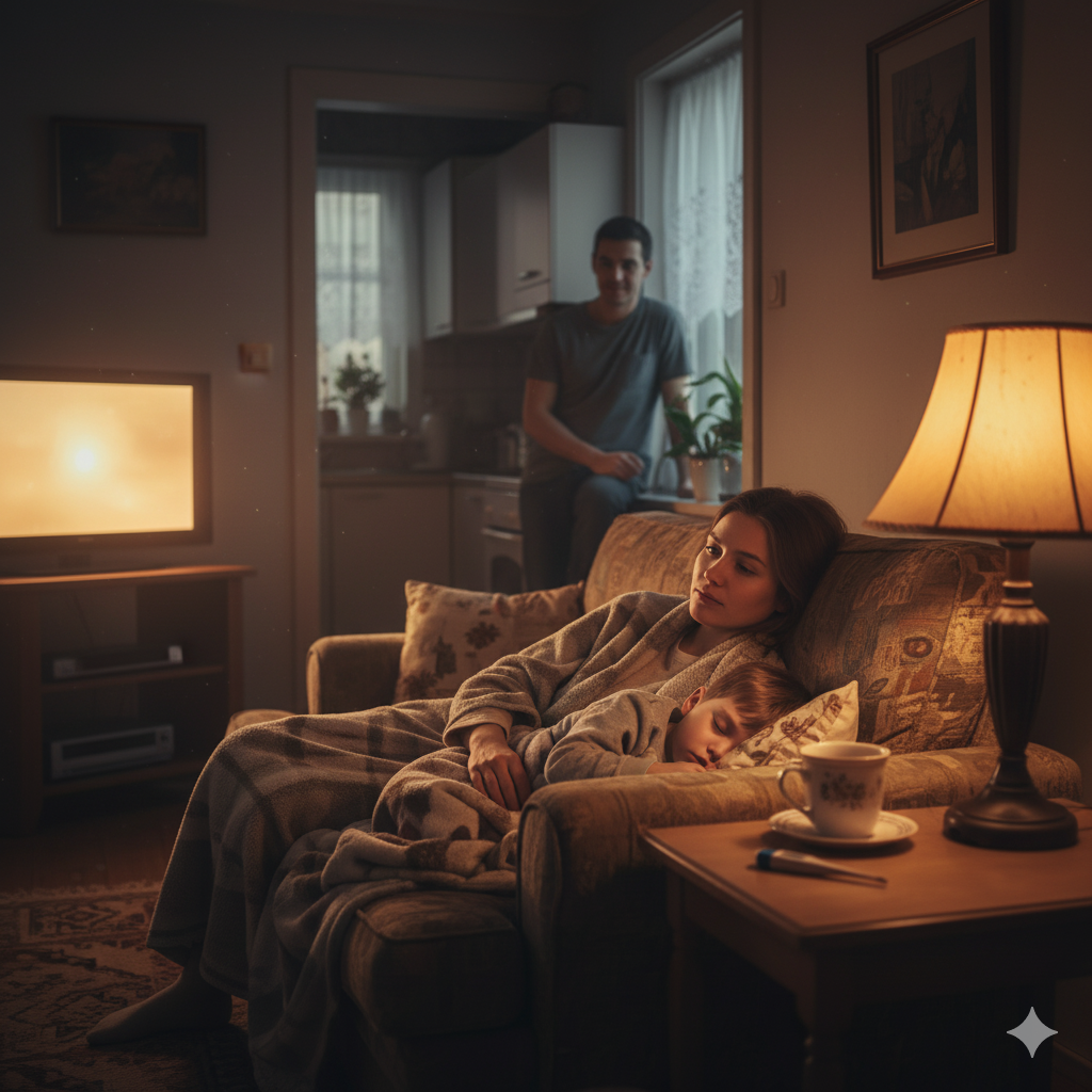 Наташа принеслась домой, и кинулась к сыну в комнату. Температура упала, и он спал. Влад смотрел телевизор.