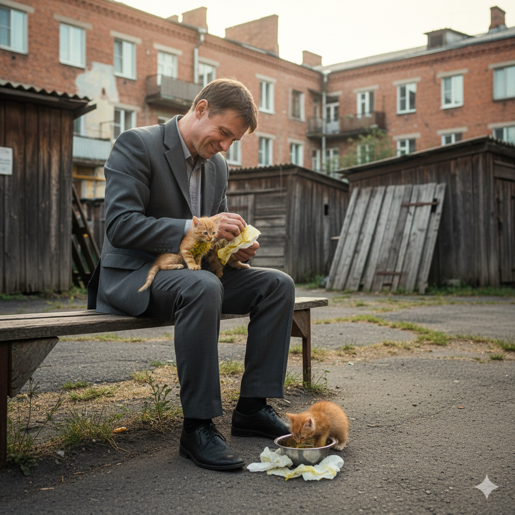 Взгляд Валерии тоже смягчился, когда она рассмотрела всю картину. Весь взъерошенный, с пятнами масла на рубашке и мятым пиджаком рядом на лавке, Виталик аккуратно вытирал котёнка.