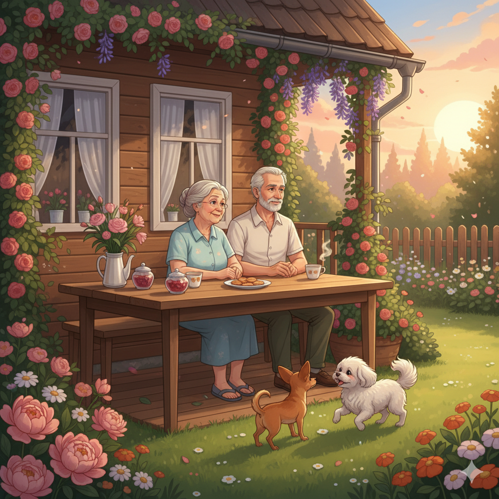 Лето уже взяло под ручку осень — стоял конец августа. Илья Петрович и Мария Ивановна пили чай на веранде и наблюдали, как играют рыжая Кнопка и белая Милка.