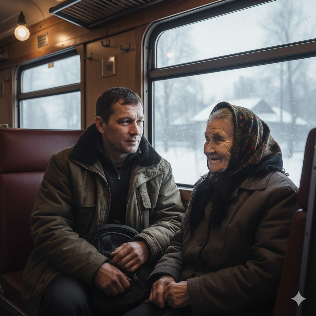 Мужчина присел напротив пожилой женщины, поставил рядом рюкзак, скинул капюшон и расстегнул теплую куртку. Тоже стал смотреть в окно. А вскоре электричка тронулась и побежала по рельсам, рассекая белую мглу, за окном зима.