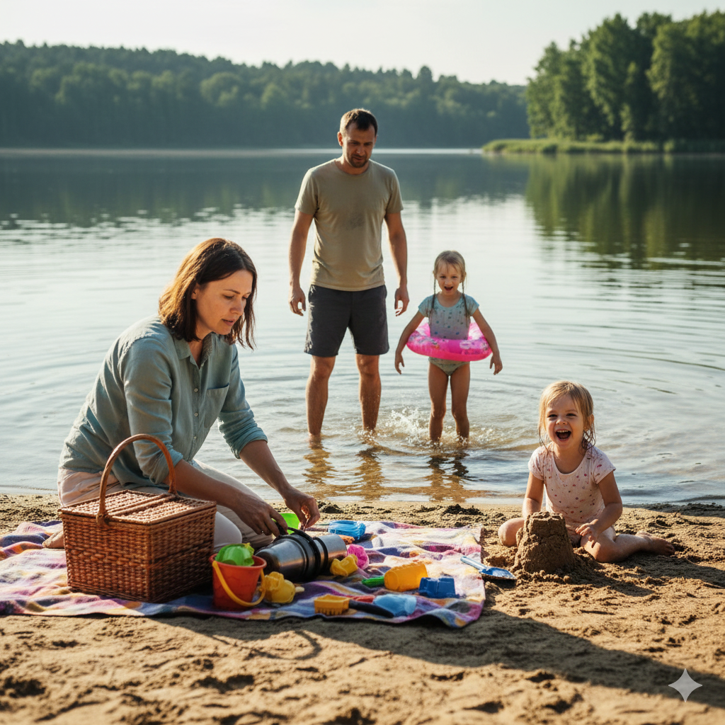 Они, наконец вырулили из пролеска, показалось зеркальная поверхность озера, отдыхающие на берегу. Девочки отбросили гаджеты, начали возбуждённо спрашивать маму: не забыли ли они надувной круг, матрац, нарукавники, игрушки для песка. Мама отвечала, перечисляя всё, что они взяли с собой. Папа искал место для остановки вдоль берега, девочкам не терпелось выбраться из машины. Скорее к воде!
