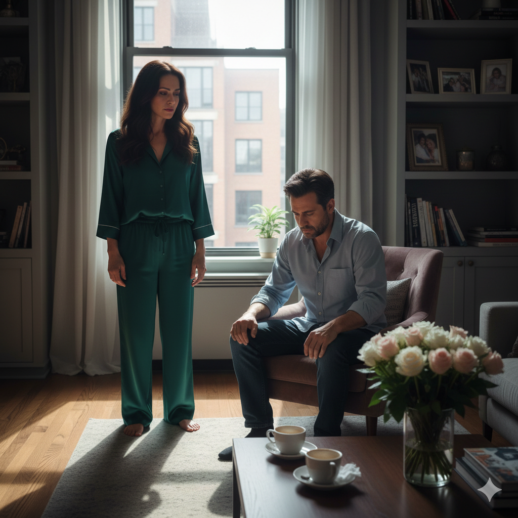 Андрей вошёл в гостиную с букетом цветов и улыбкой. Его взгляд изменился, когда он увидел её лицо. — Что случилось?