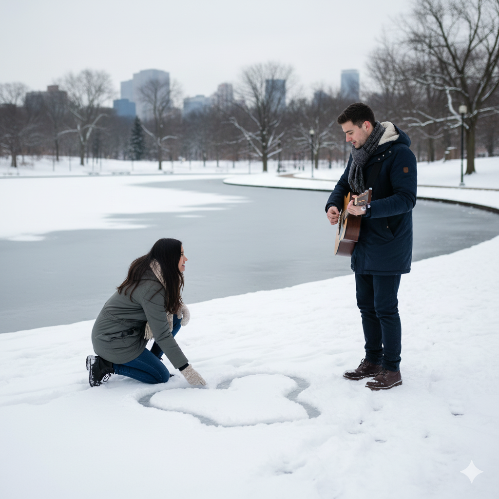 Наступила зима, и город окутало белоснежное одеяло. Алексей решил сделать Марии сюрприз — он пригласил её на зимнюю прогулку к озеру, где они провели множество дней летом. В тот день он принёс с собой гитару и стал играть их любимую мелодию. Вокруг кружились снежинки, словно танцуя под звуки музыки. Мария, подошла ближе и, опустившись на колени в снегу, нарисовала пальцами сердечко на холодной поверхности.