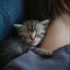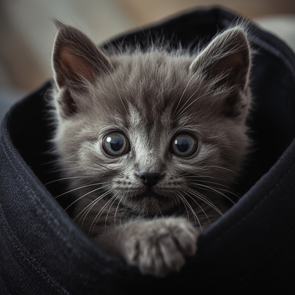 Маленький серый котёнок выглянул из сумки. Он смотрел на женщину испуганными глазками.