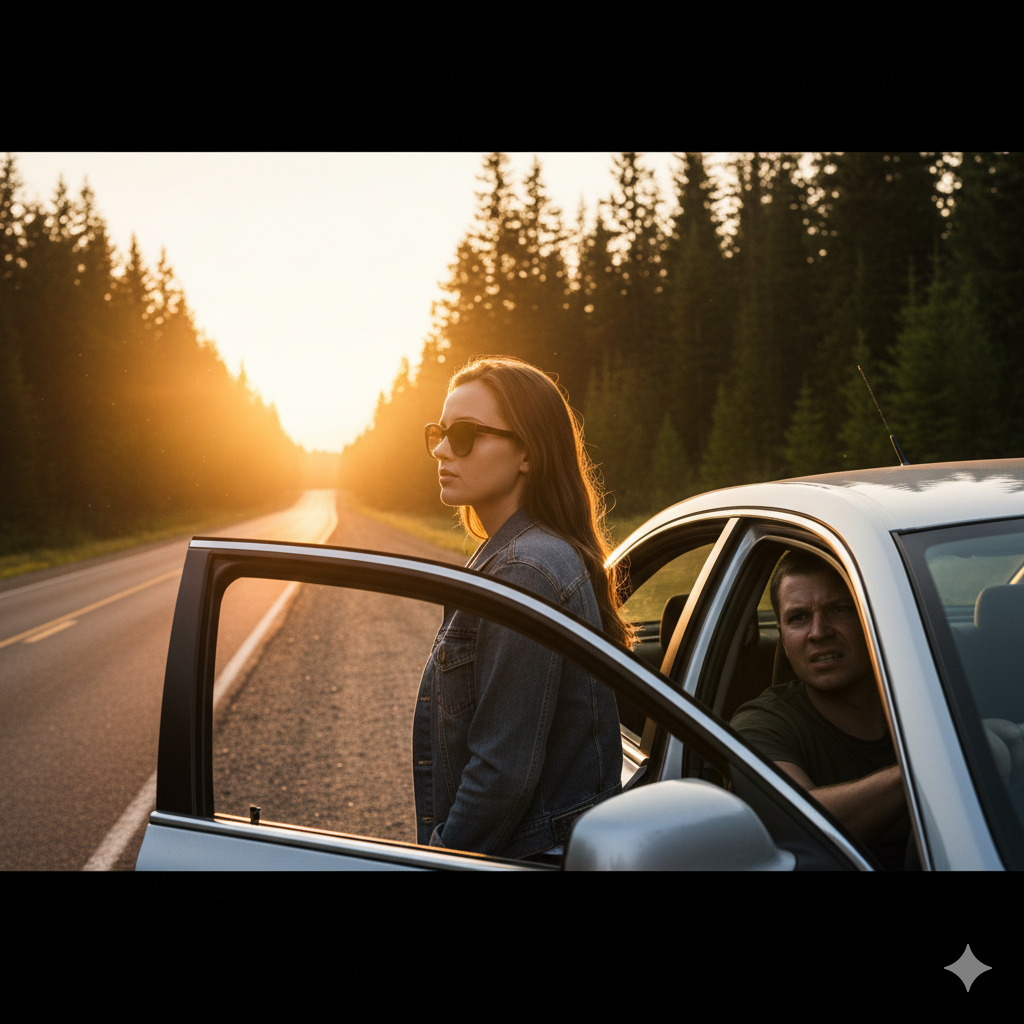 В этот момент Егор резко затормозил. Машина, взвизгнув шинами, остановилась на узкой лесной обочине. Вокруг них плотным кольцом стоял густой, мрачный лес, зловеще поскрипывая под порывами ветра. Солнце, до этого нещадно палившее, скрылось за горизонтом, и лес погрузился в полумрак. Темнело с каждой секундой.