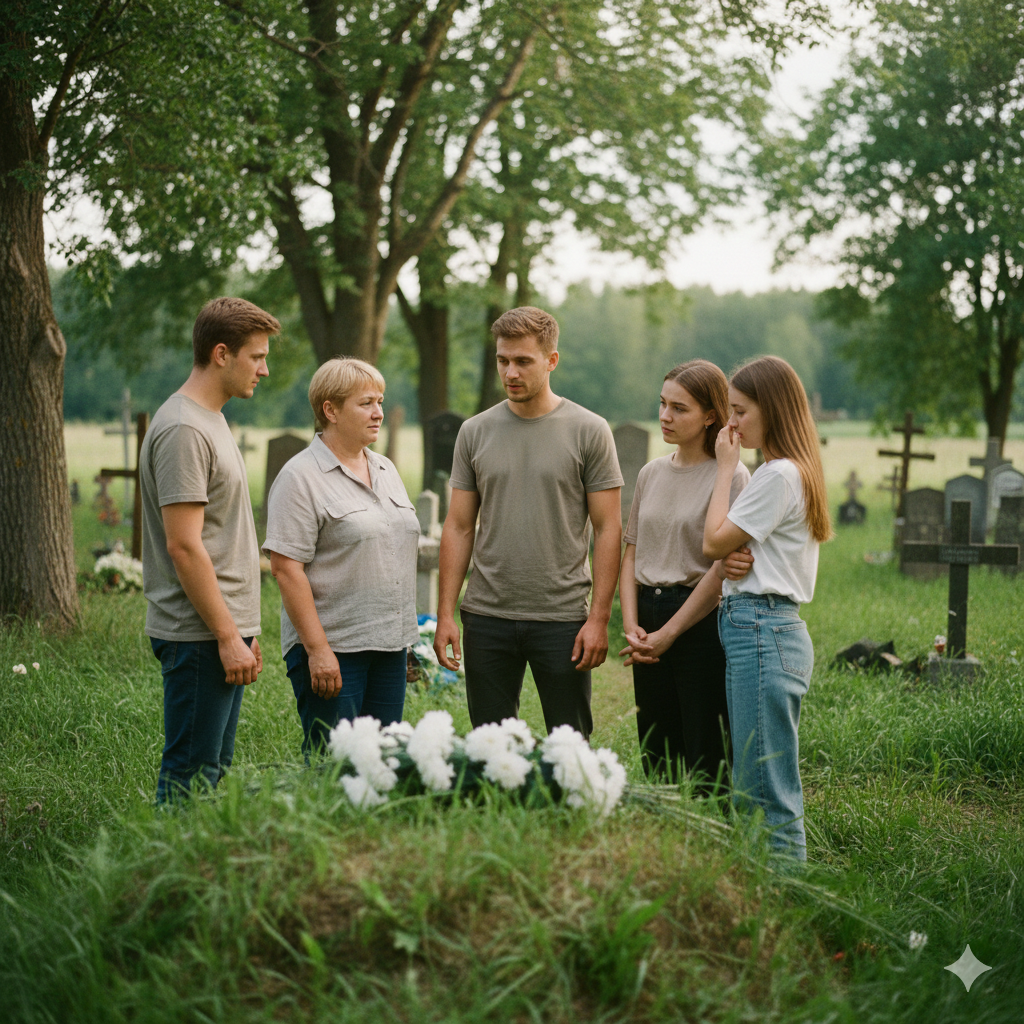 Летний день на деревенском кладбище. Похороны. У свежей могилы стоят несколько человек в траурных одеждах со скорбными лицами.