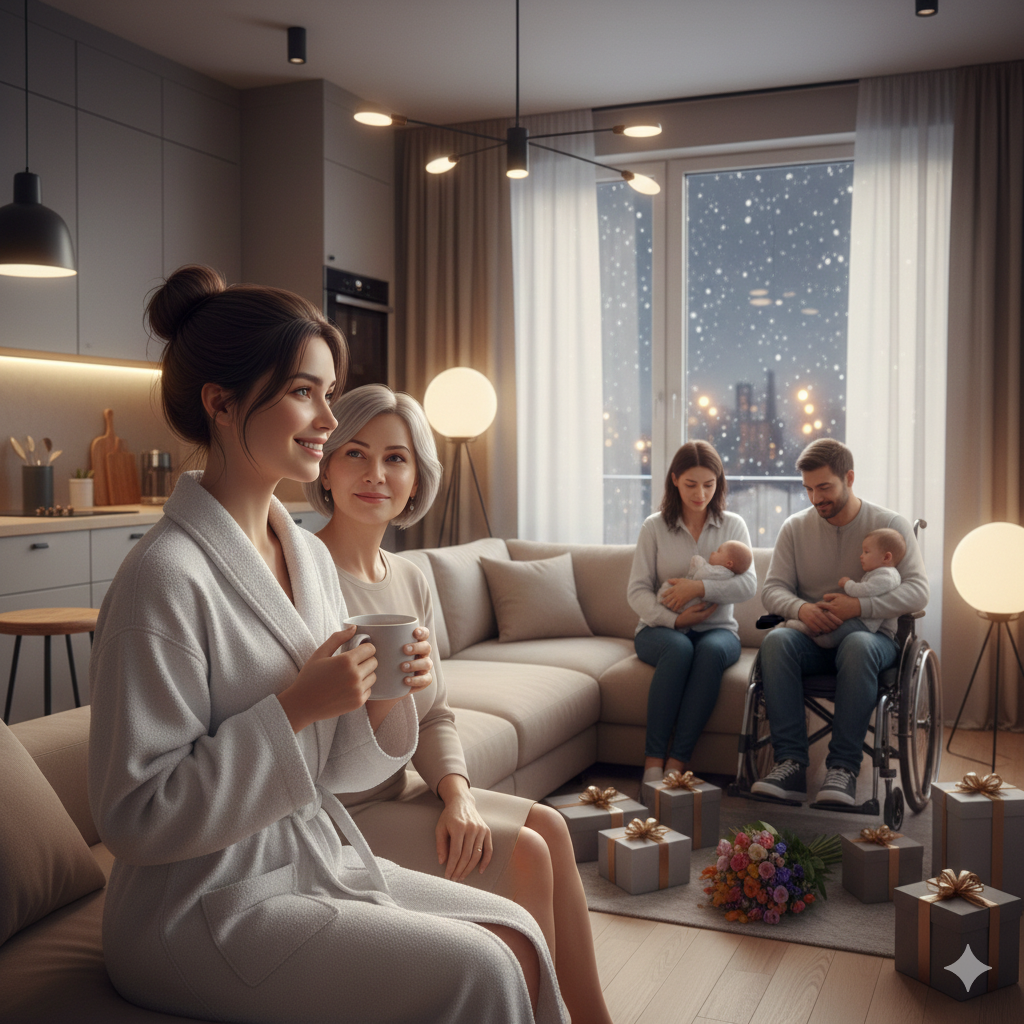 Алина подошла к окну и посмотрела по сторонам. Город постепенно погружался во тьму, и только уличные фонари мерцали, словно звёзды на небосклоне. В окнах домов мерцал тёплый свет. Вот кто-то включил громкую музыку, и было видно, что там много народу. Наверняка что-то празднуют, промелькнуло в мыслях у Алины. Вот молодая женщина что-то качает на руках, наверняка младенца, а вот… Алина не успела досмотреть, когда из прихожей донёсся звук звонка.