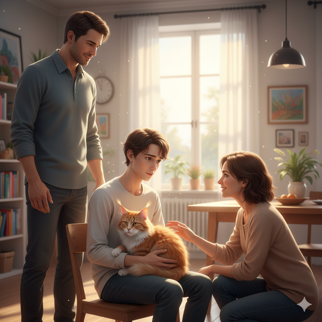 Войдя в комнату, она увидела, кота на коленях Жени. Мальчик гладил пушистую рыжую спину, кот мурлыкал.