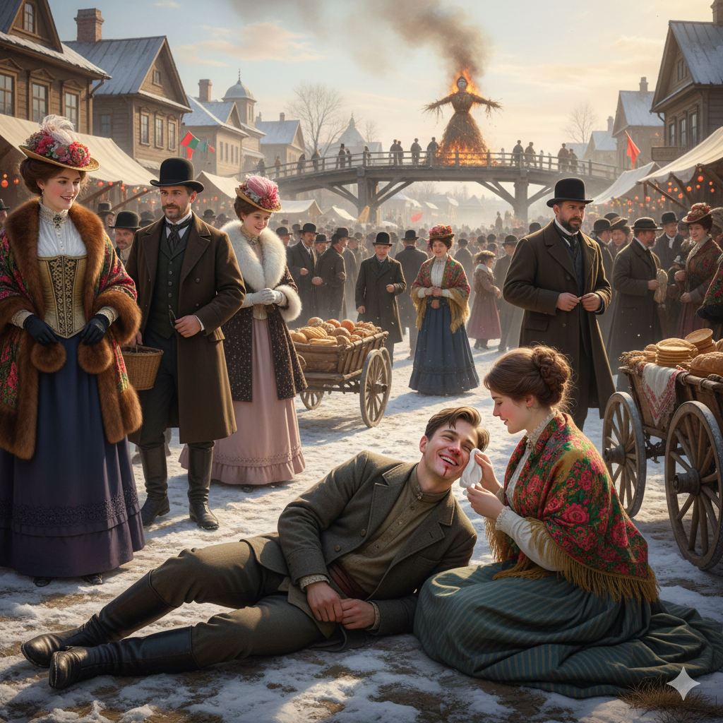 Широкая Масленица шумела и плясала. Веселье не вмещалось на ярмарочной площади — выплёскивалось на соседние улицы, на широкий деревянный мост, на реку. Уже съели все блины, достали сапоги со столба, накатались на качелях и взяли приступом снежный городок, а праздник не заканчивался. Оставалось только сжечь чучело Масленицы, но перед этим люди ждали главного представления.