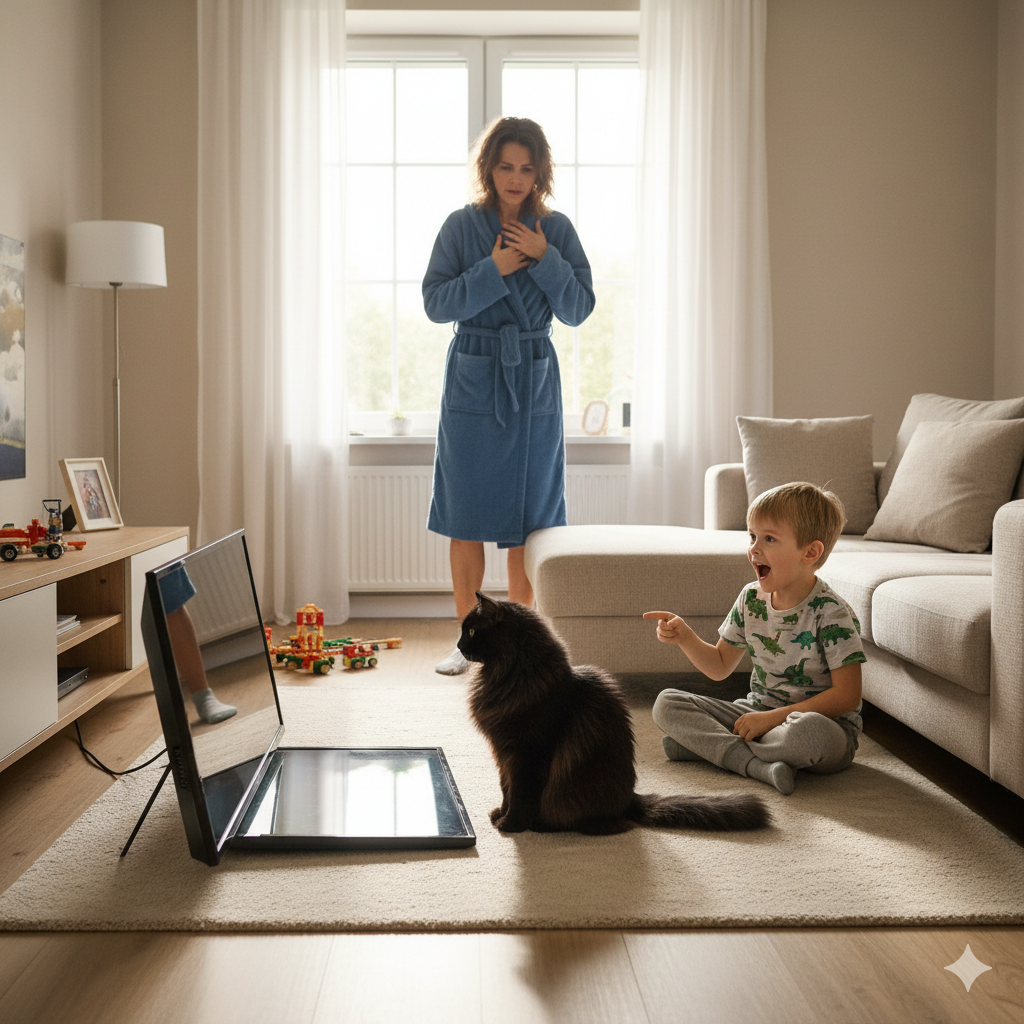 Кот подпрыгнул, зацепился за край телевизора, повис… Грохот заставил Вовку подскочить на диване. Из комнаты выбежала Таня. Поверженный телевизор лежал на паласе, а рядом Матвей делал вид, что он здесь ни при чем…