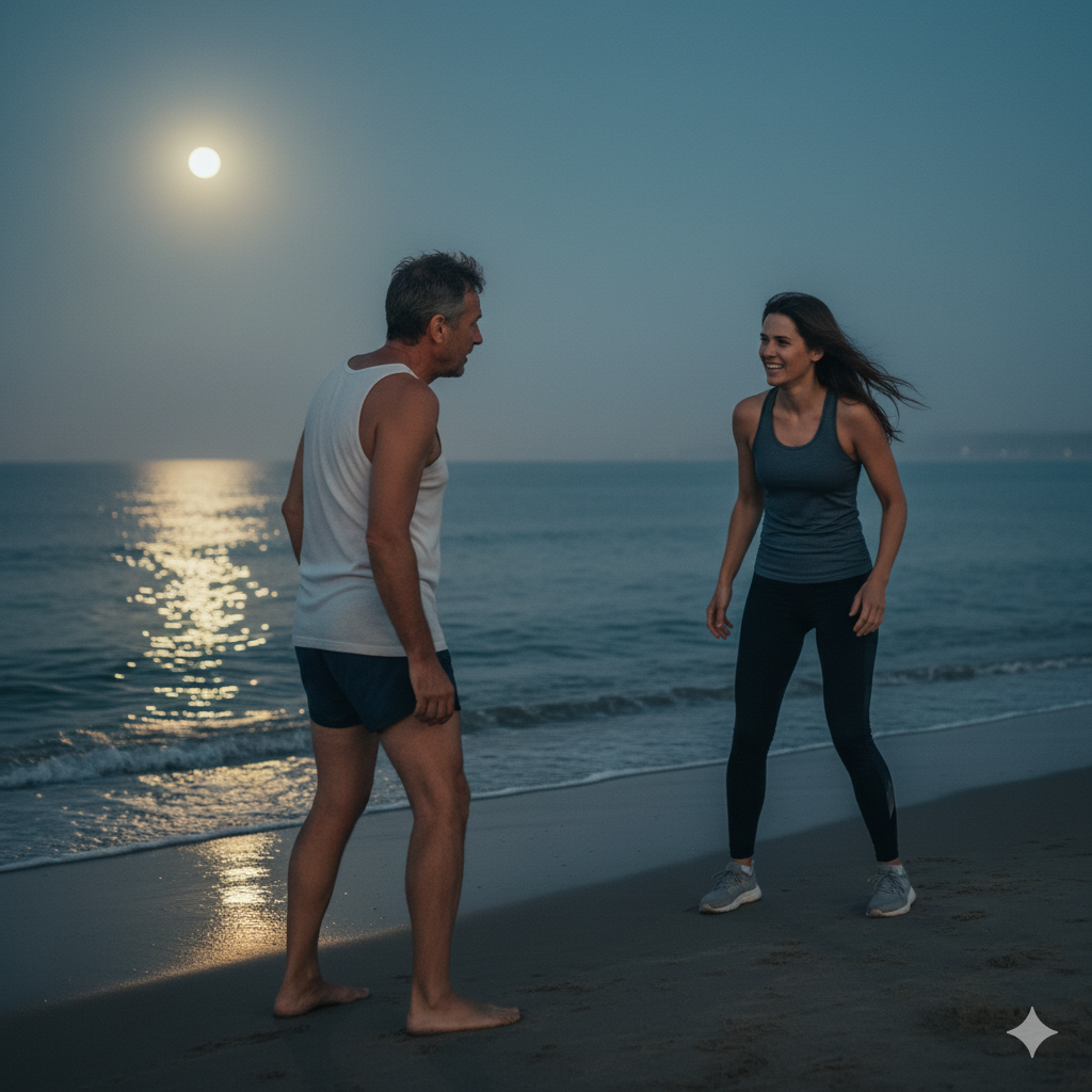 Это уже вошло в добрую традицию. Каждый вечер, как только на небе появлялась луна, мы с ней вдвоём появлялась на песчаном безлюдном пляже, и начинали пробежку. Она — в модной спортивной обтягивающей одежде – бежала впереди, а я, в трусах, которые были очень похожие на семейные, и в майке — чуть сзади.