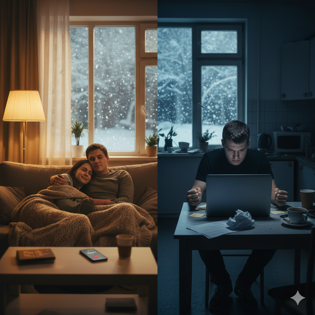 В квартире Карины и Егора царила совсем другая атмосфера – тёплая и умиротворяющая. За большим окном разворачивалось белоснежное представление, а внутри, за плотно закрытыми стёклами, было уютно и спокойно. Настольная лампа излучала мягкий, приглушённый свет, который создавал вокруг себя круг тёплого сияния, отгоняя зимнюю прохладу.
